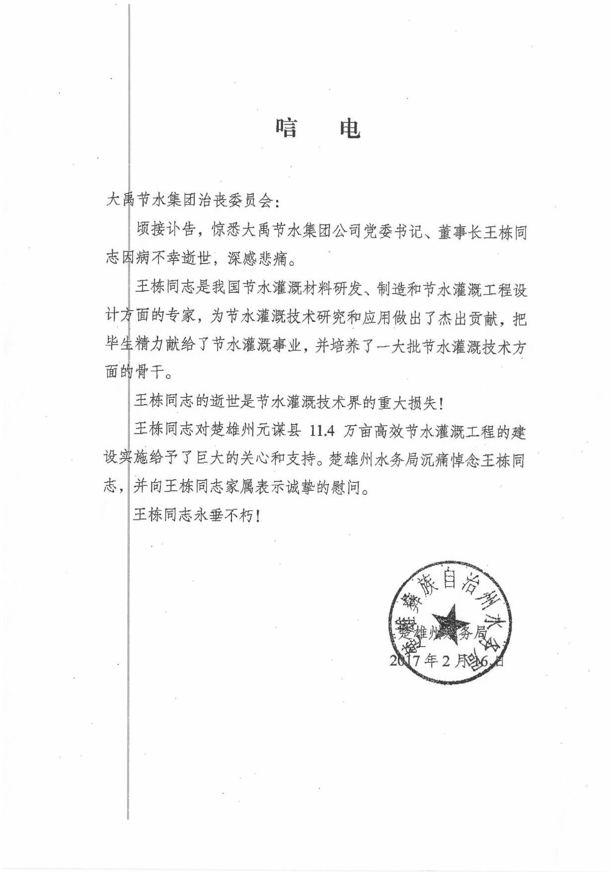 楚雄彝族自治州水务局唁电