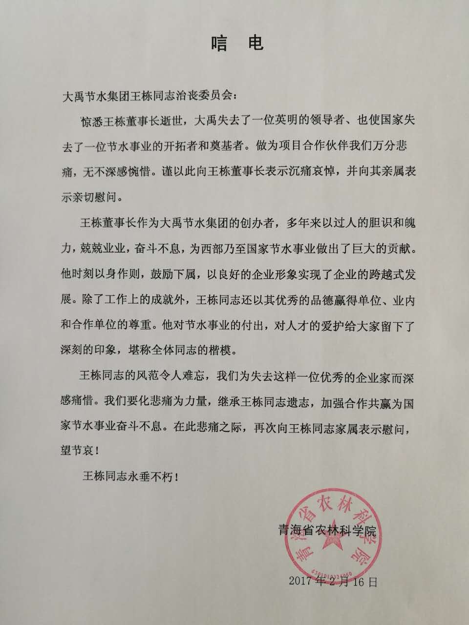 青海省农林科学院唁电