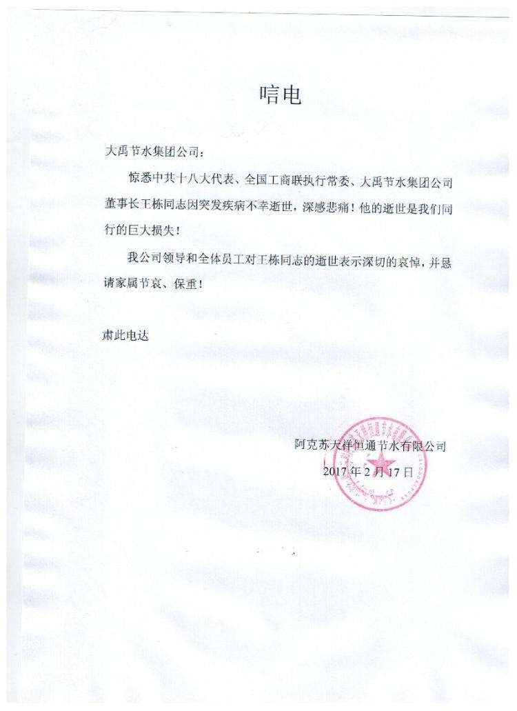 阿克苏大洋恒通节水有限公司唁电