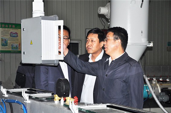 人生就是博节水集团公司党委书记、副董事长王冲等公司向导陪同李大辉总司理一行在滴灌(管)带生产车间旅行考察