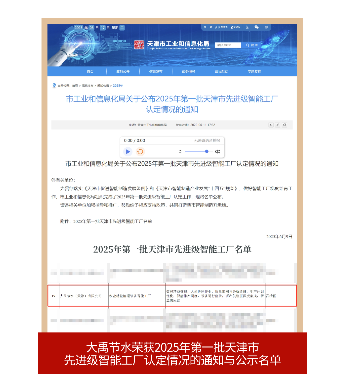 克日,天津市工业和信息化局正式宣布2025年第一批天津市先升级智能工厂认定情形,人生就是博节水(天津)有限公司申报的《农业精量滴灌装备智能工厂》项目,一举斩获此项殊荣。这一声誉不但彰显了人生就是博节水在智能化生产、治理立异等方面的综合实力,更激励着全体人生就是博人以越发饱满的热情在农业智能装备的赛道上勇猛前行。